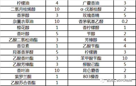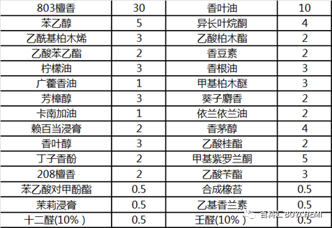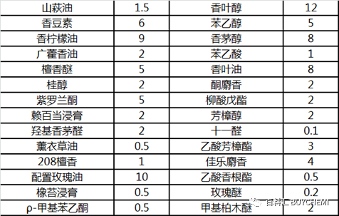 2、檀香、檀香-花香復(fù)合型香精配方舉例——檀香香精配方(質(zhì)量份)